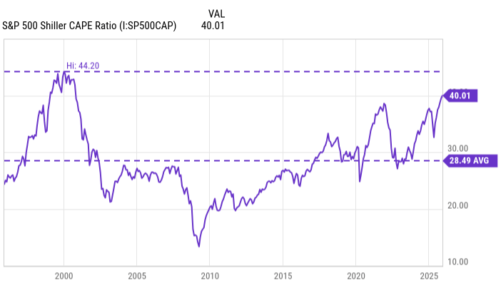 A CAPE of 25 or above is generally considered elevated. A CAPE above 30 is rare. A CAPE of 40.1 has, in modern market history, occurred essentially once before: in 1999, at the height of the dot-com boom.